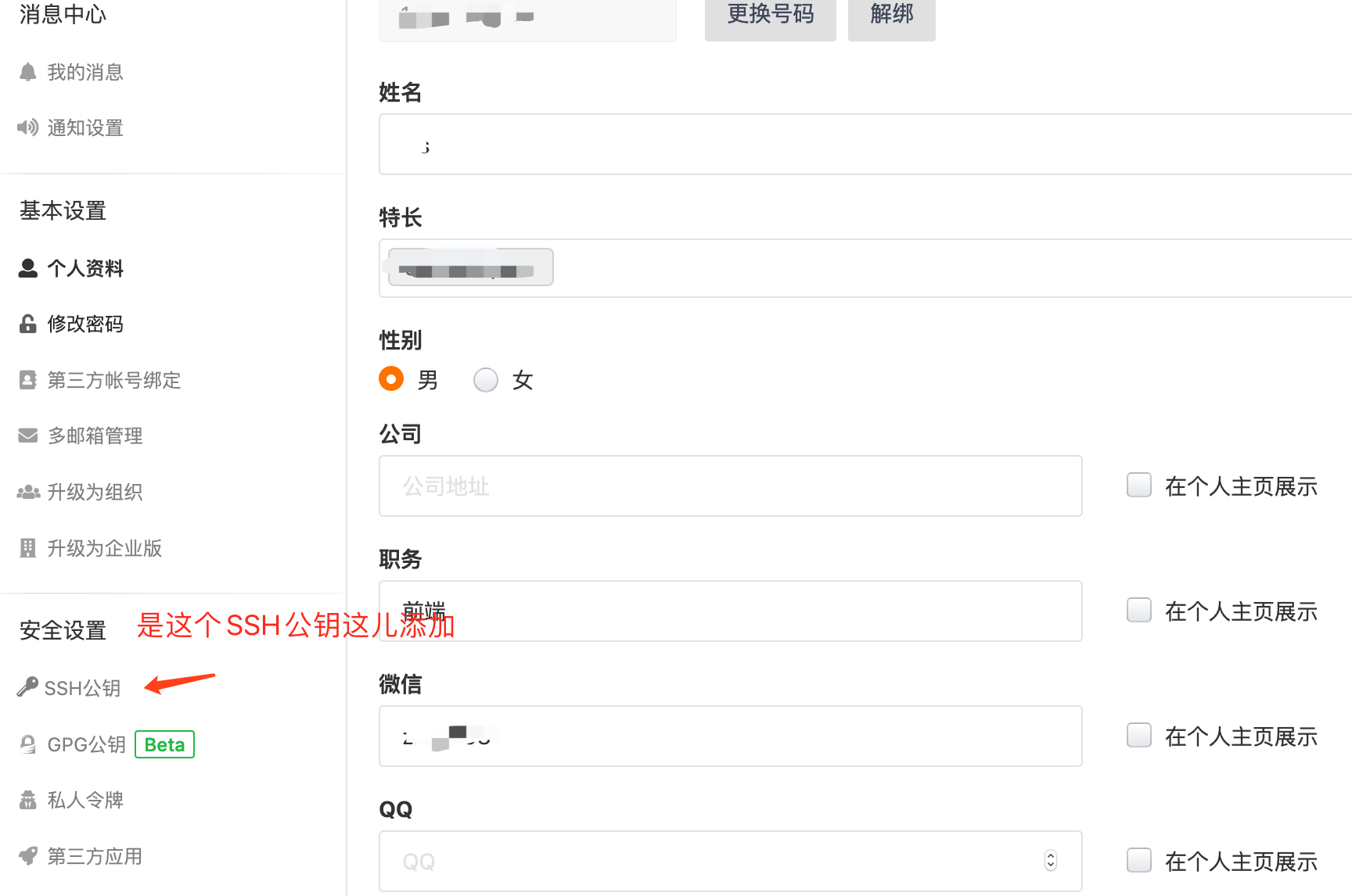 建立的仓库过后,然后去码云个人用户信息里 设置里面注意这儿不是这儿